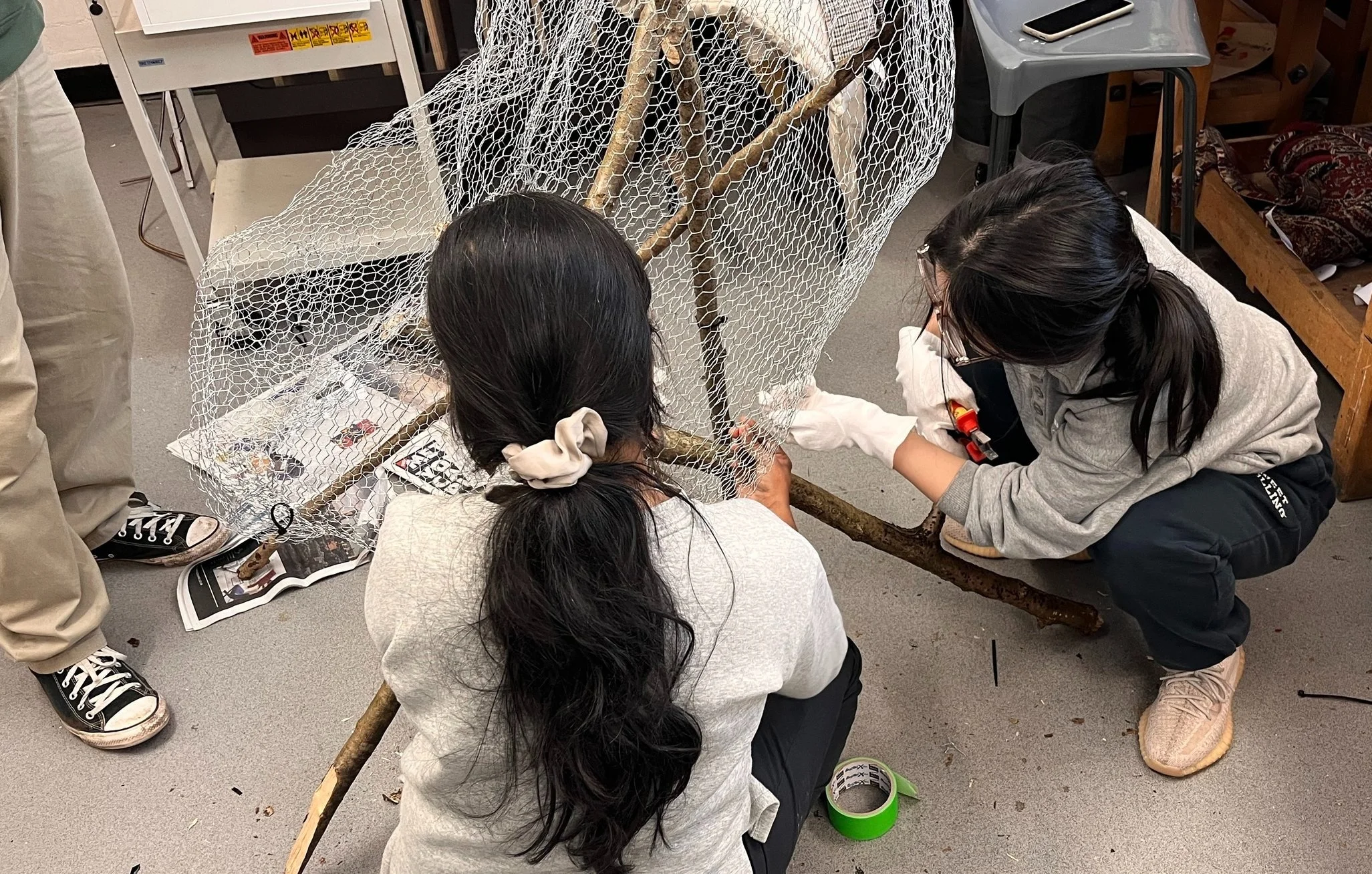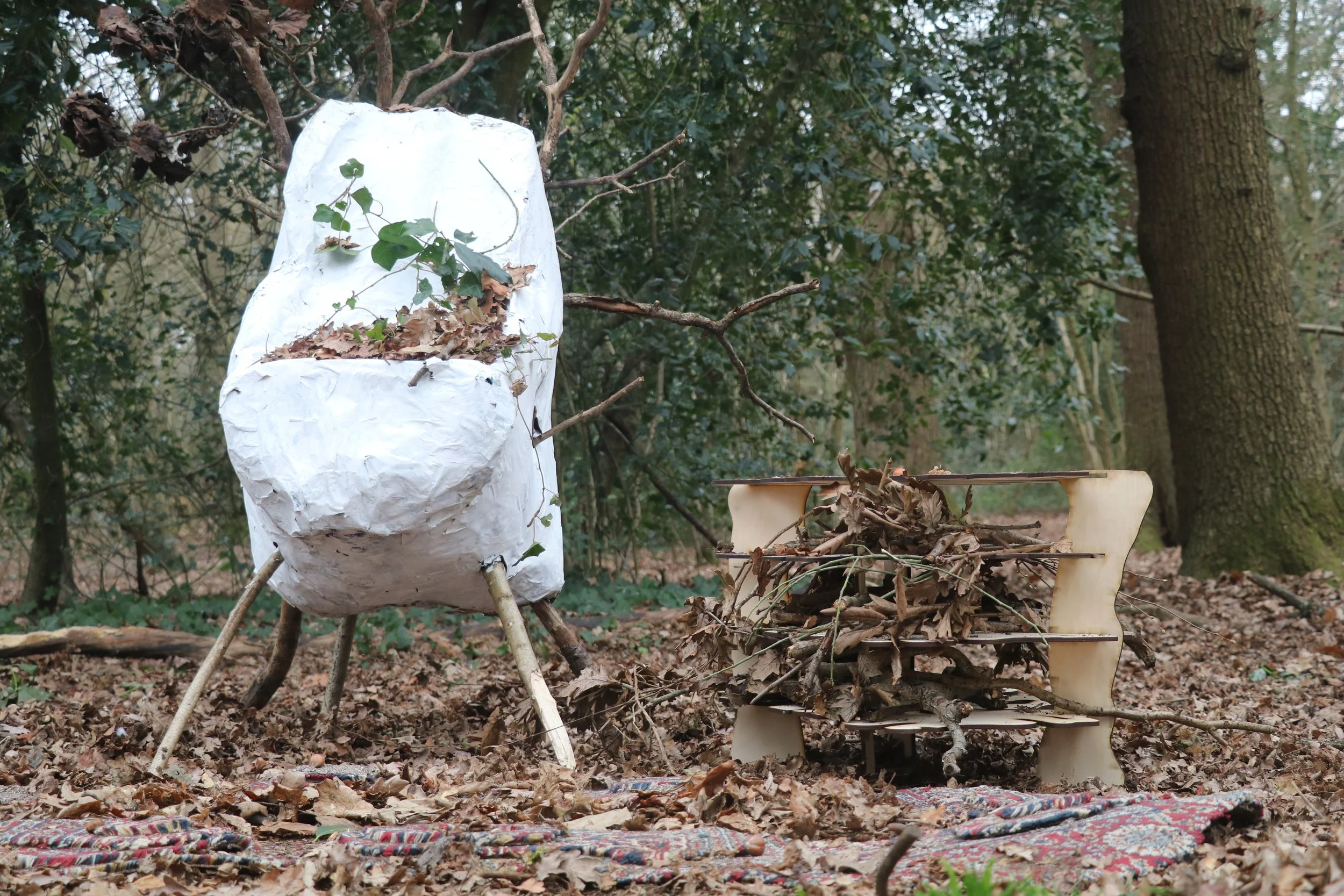 The chair is constructed using branches and wire mesh for its frame and support. We covered the surface with newspaper and left holes suitable for birds to build nests in.